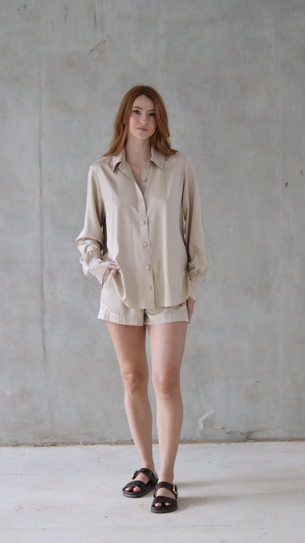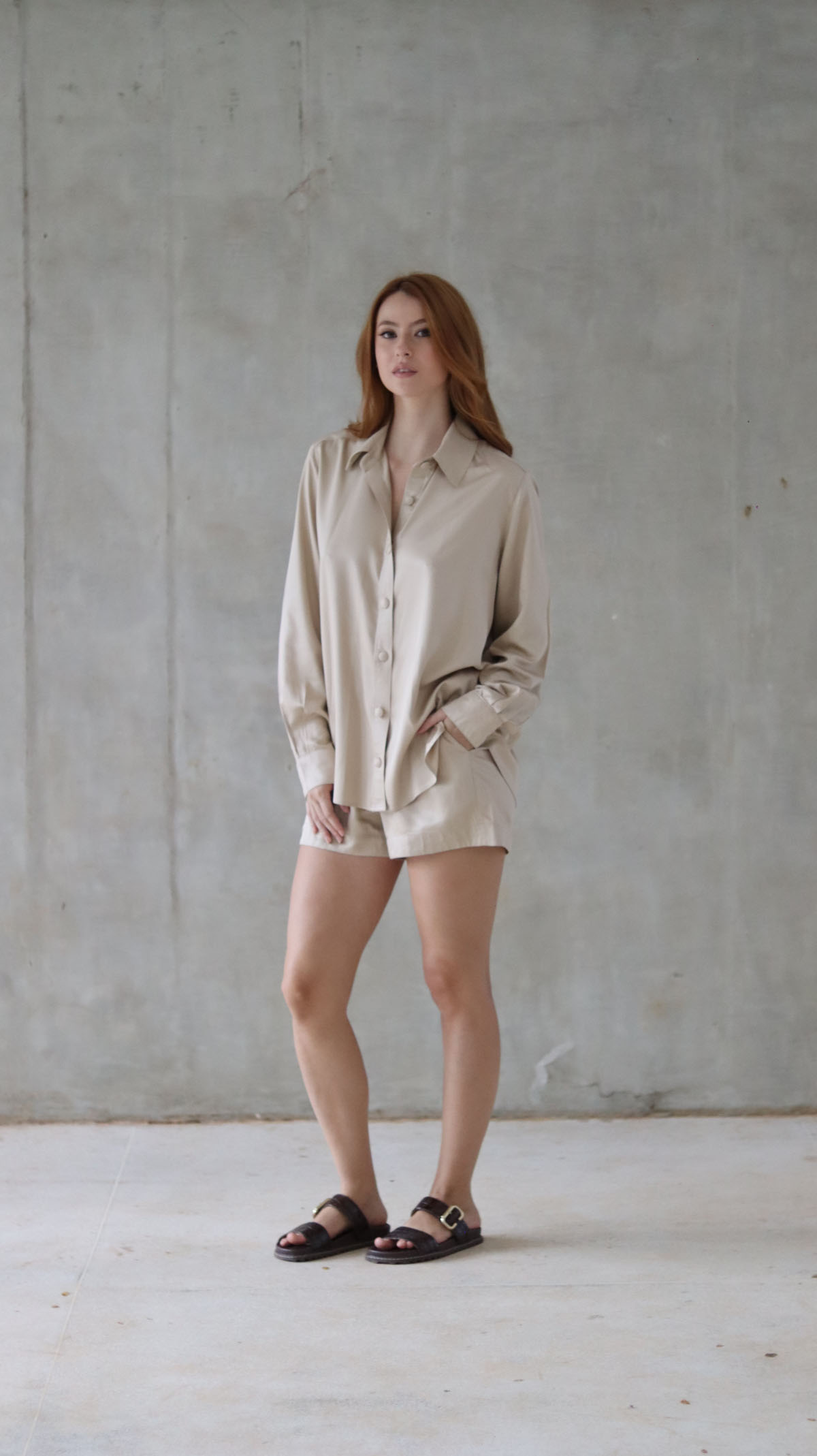 Short – feito em fibra de bambu. Possui botões encapados e elástico no cós trazendo conforto para a peça.