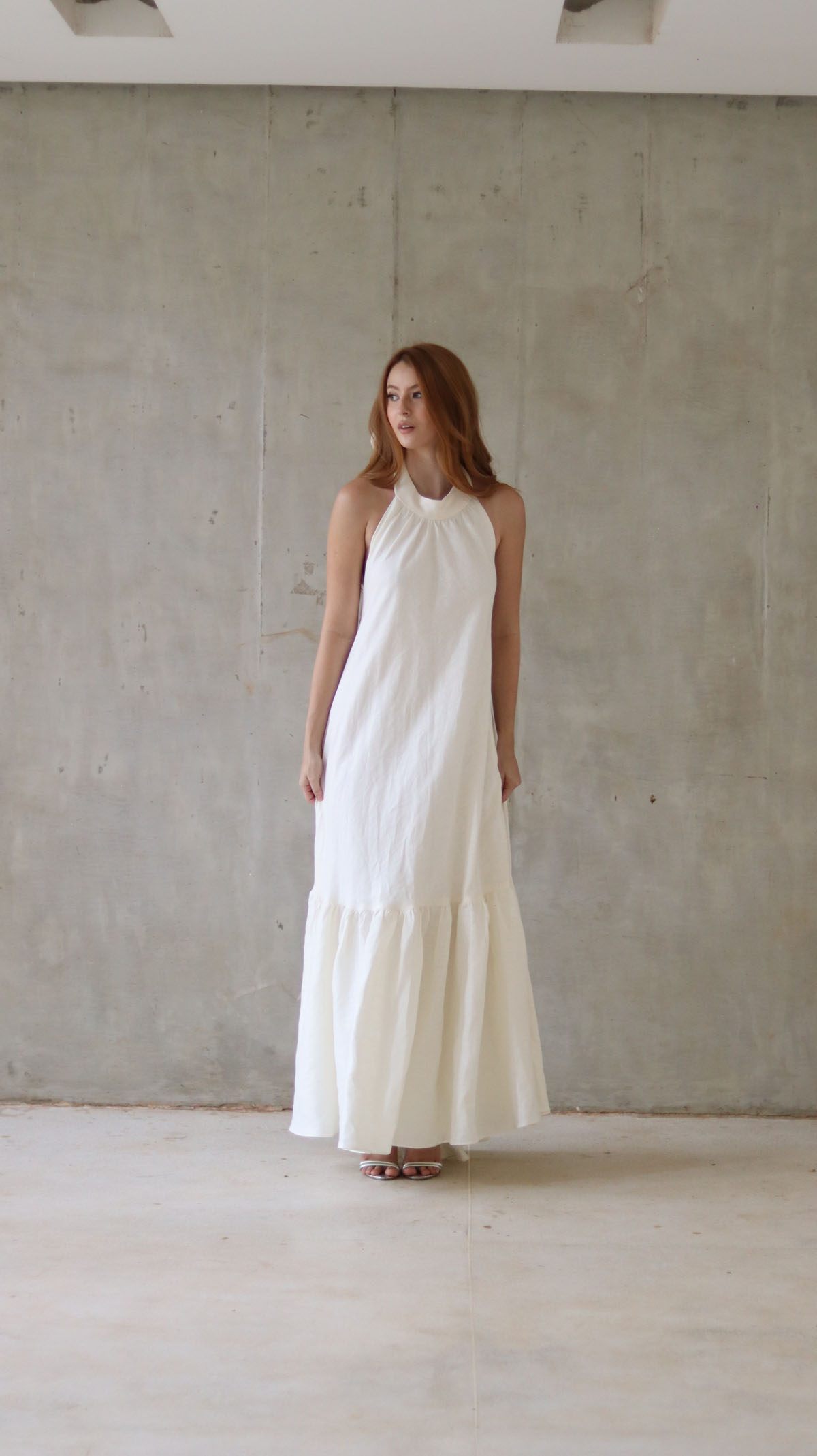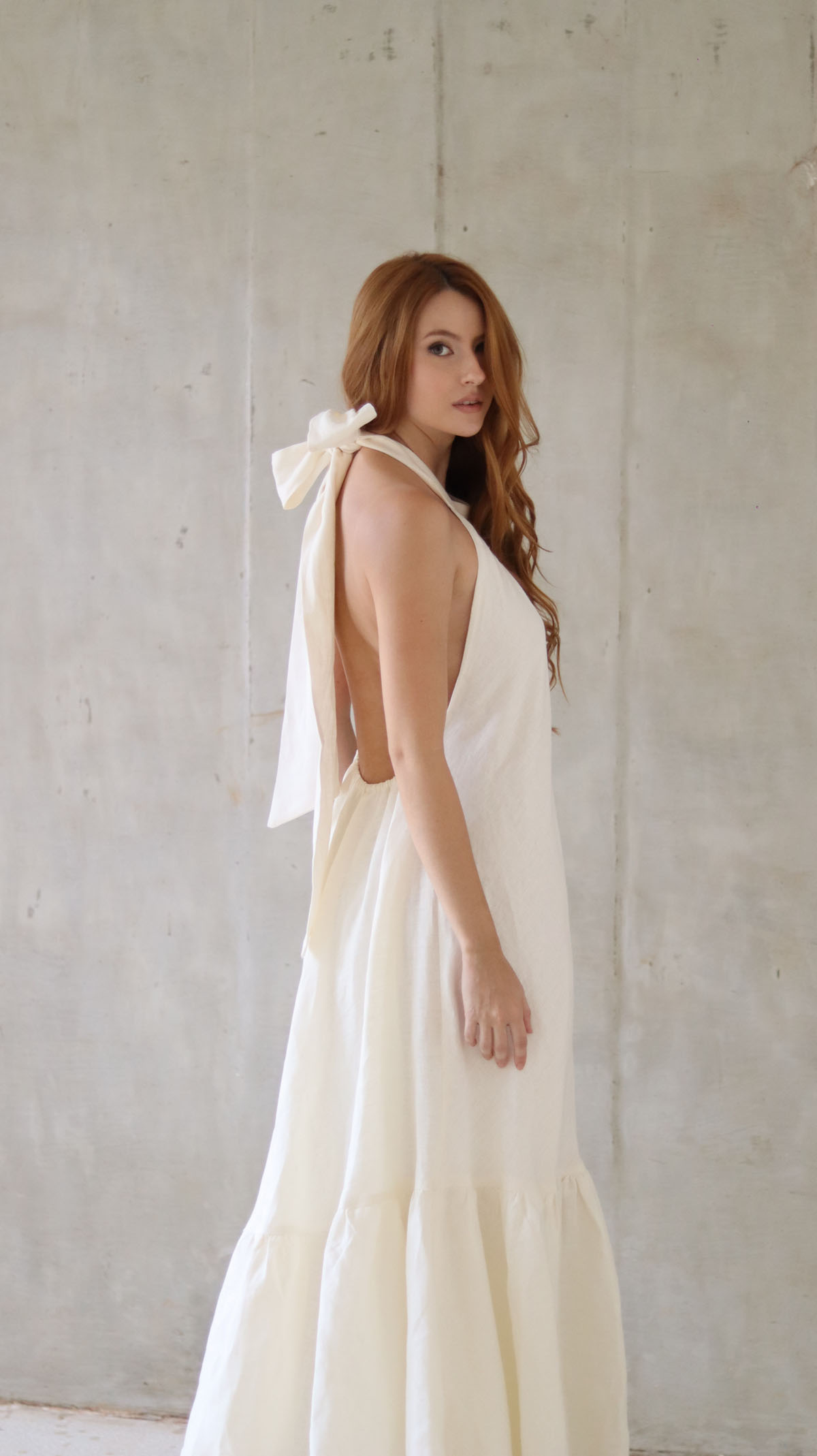 Vestido Dila – feito em 100% linho e forro em crepe. Possui um laço fazendo amarração no pescoço dando um ar romântico para a peça.