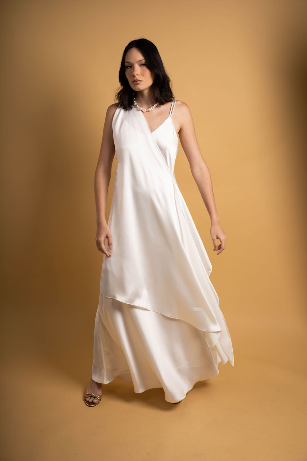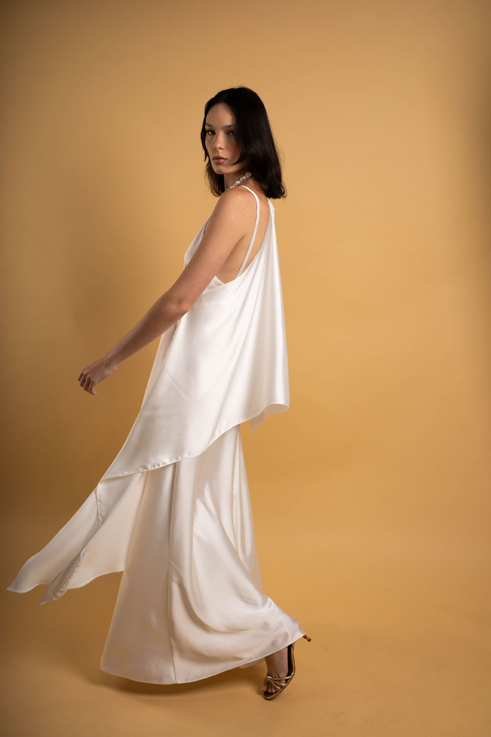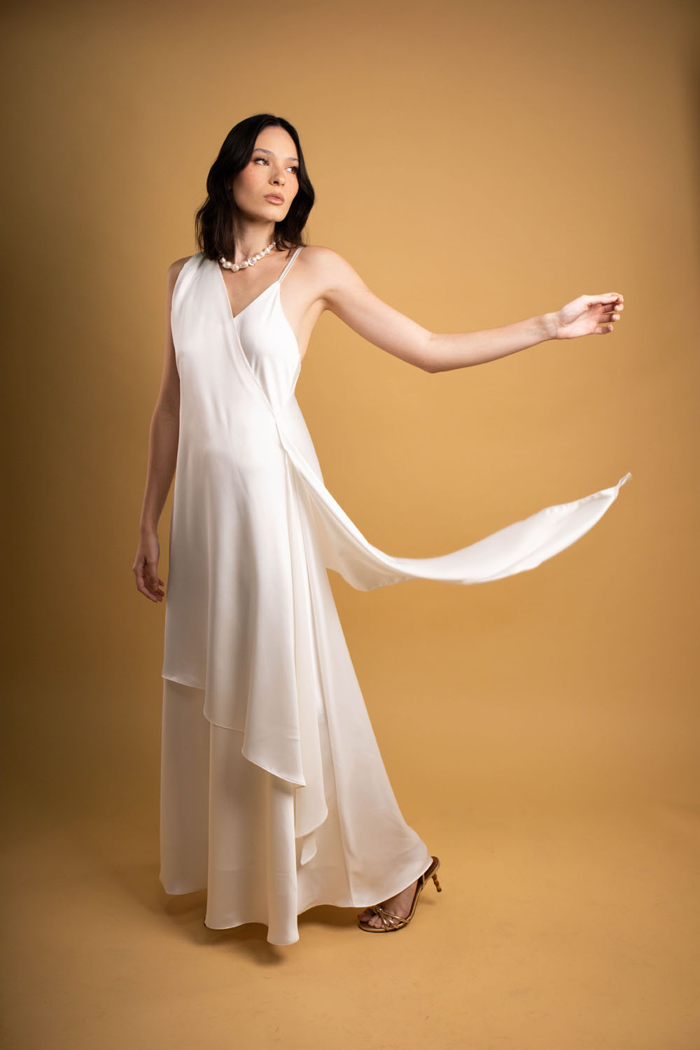 Vestido Efemero – vestido feito em crepe Prada. Possui uma capa para compor o vestido e deixa-lo mais elegante.