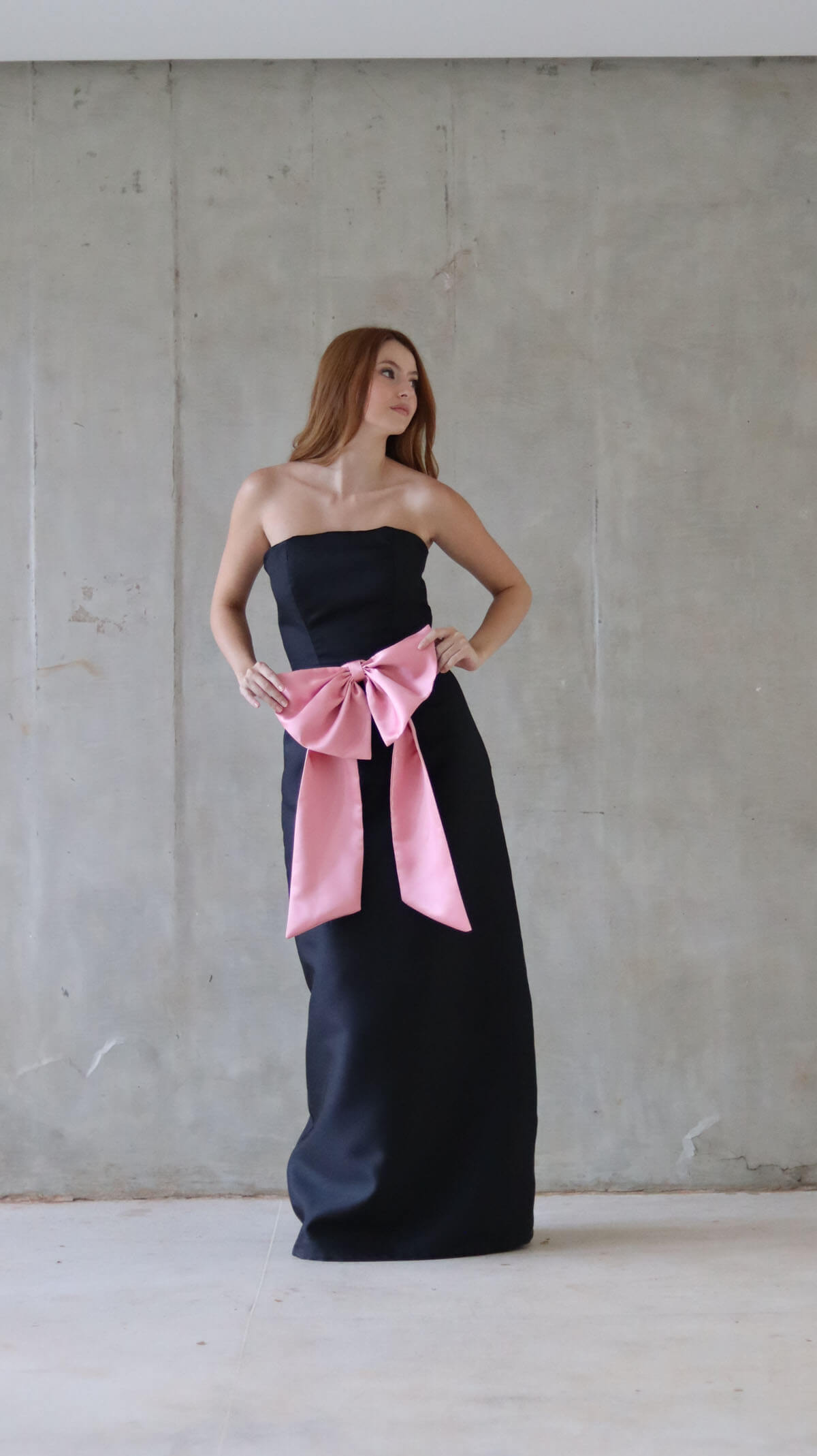 Vestido feito em Zibeline e forrado em crepe. Possui estrutura no corpo com barbatanas.