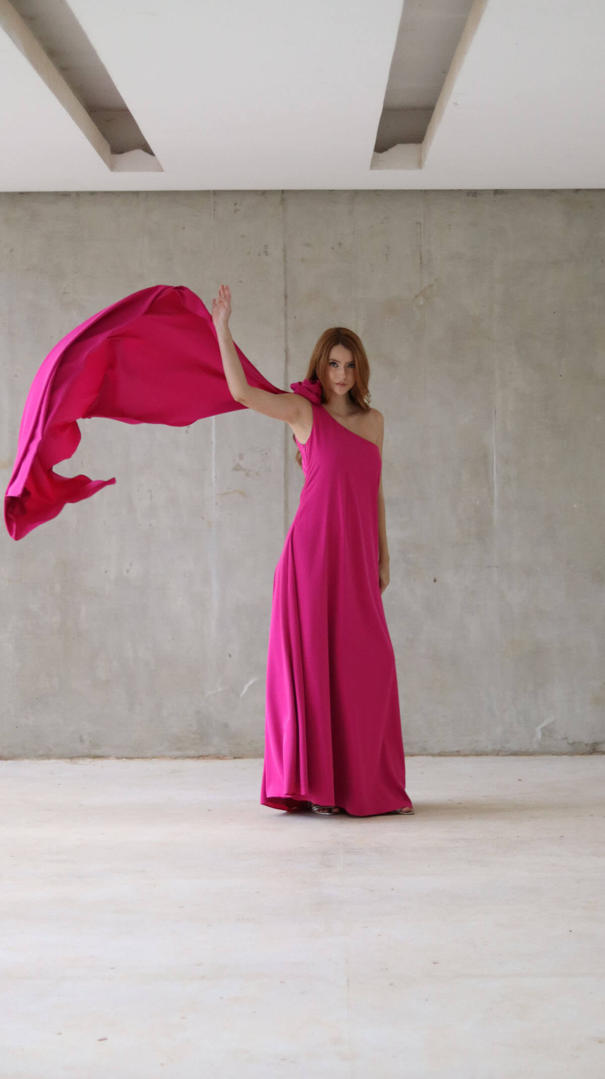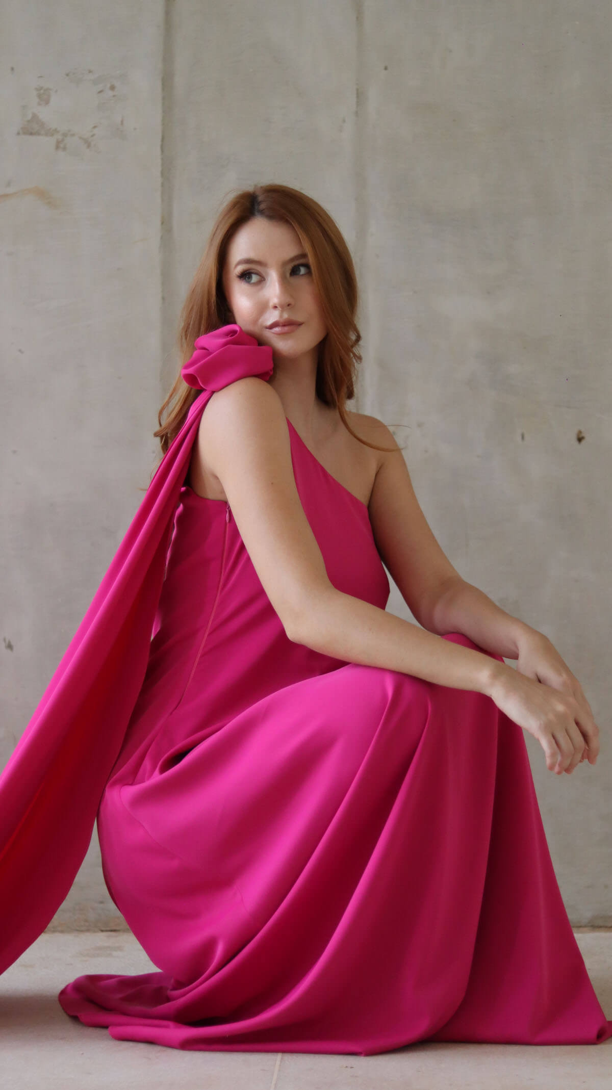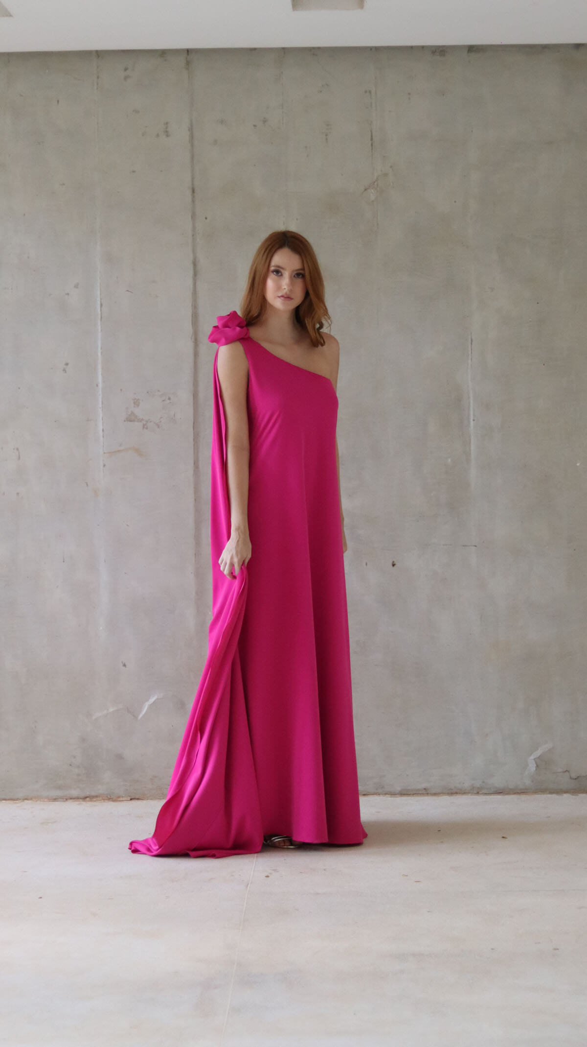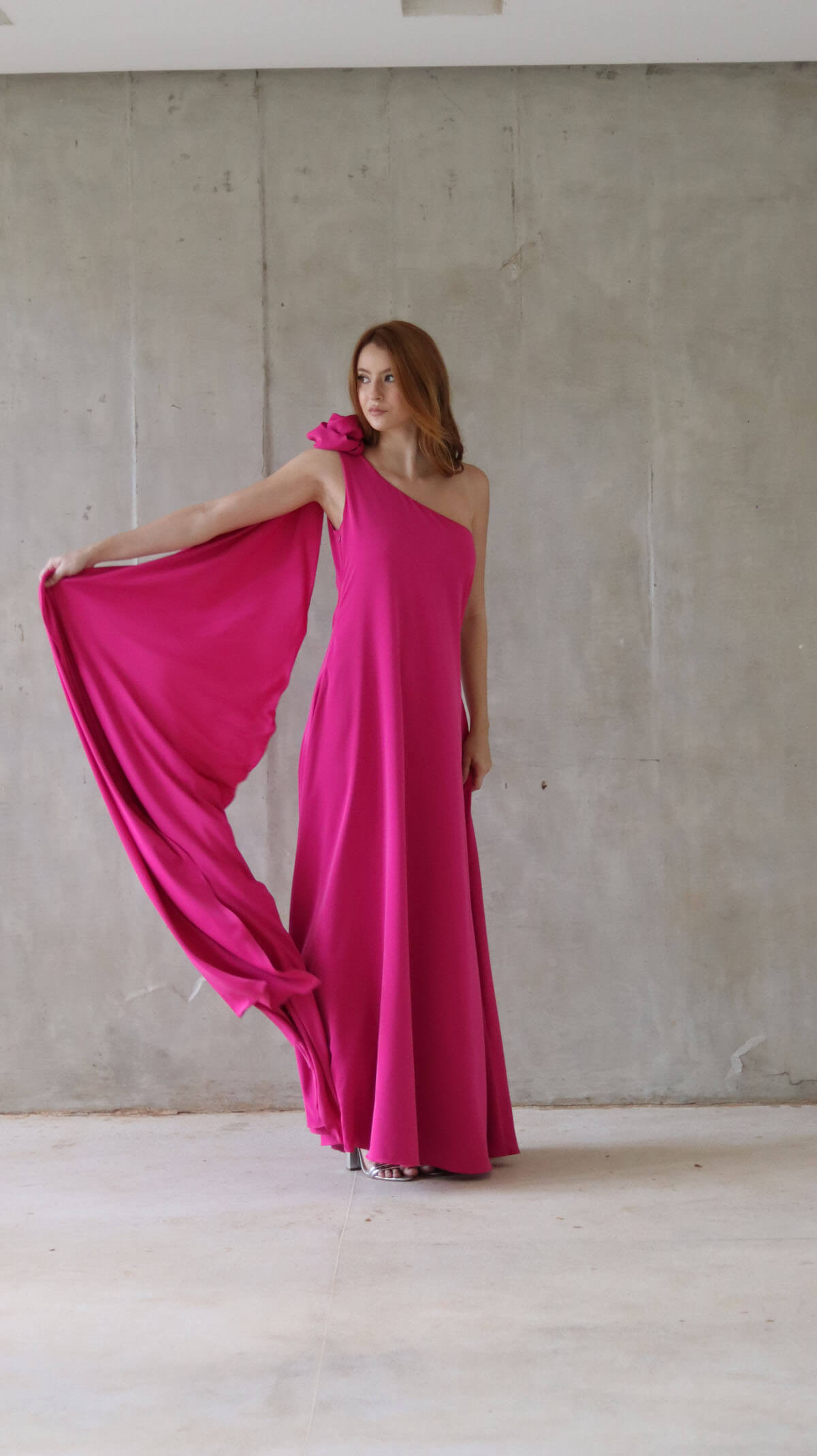 Vestido Luiza – peça feita em crepe com forro em crepe. Possui nula manga e uma capa que pode ser removida a pedido da cliente. A flor é feita à mão e arremata o charme desse vestido exclusivo.