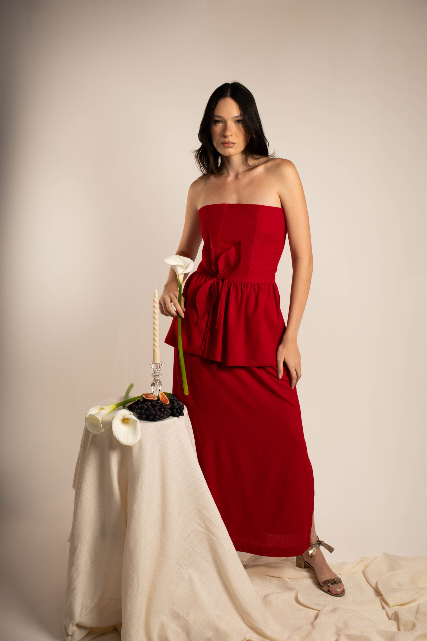 Vestido Nádia – vestido feito em linho orgânico e forrado em crepe. Possui corpo com estrutura de corset e um peplum trazendo o romantismo para a peça. Possui aplicação de copo de leite feito à mão. copo de leite feito em 100% linho.